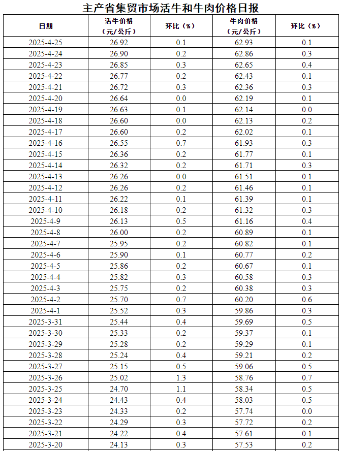 普悦 ·资讯 | 4月25日主产省集贸市场活牛和牛肉价格环比均上涨0.1%