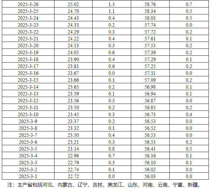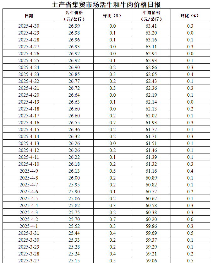 据农业农村部监测,2025年4月30日,主产省集贸市场活牛价格26.99元/公斤,同比上涨12.9%,环比持平,自3月2日起震荡上行,累计上涨4.27元,涨幅18.8%;牛肉价格63.41元/公斤,同比上涨1.1%,环比上涨0.3%,自3月2日起震荡上行,累计上涨7.38元,涨幅13.2%。