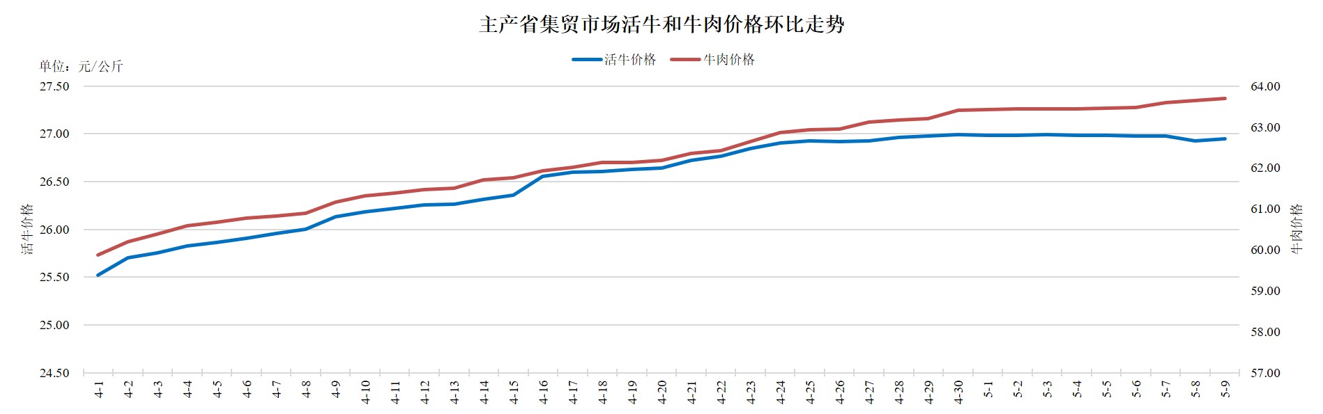 据农业农村部监测,2025年5月9日,主产省集贸市场活牛价格26.95元/公斤,同比上涨14.8%,环比上涨0.1%;牛肉价格63.69元/公斤,同比上涨3.3%,环比上涨0.1%,自3月2日起震荡上行,累计上涨7.66元,涨幅13.7%。