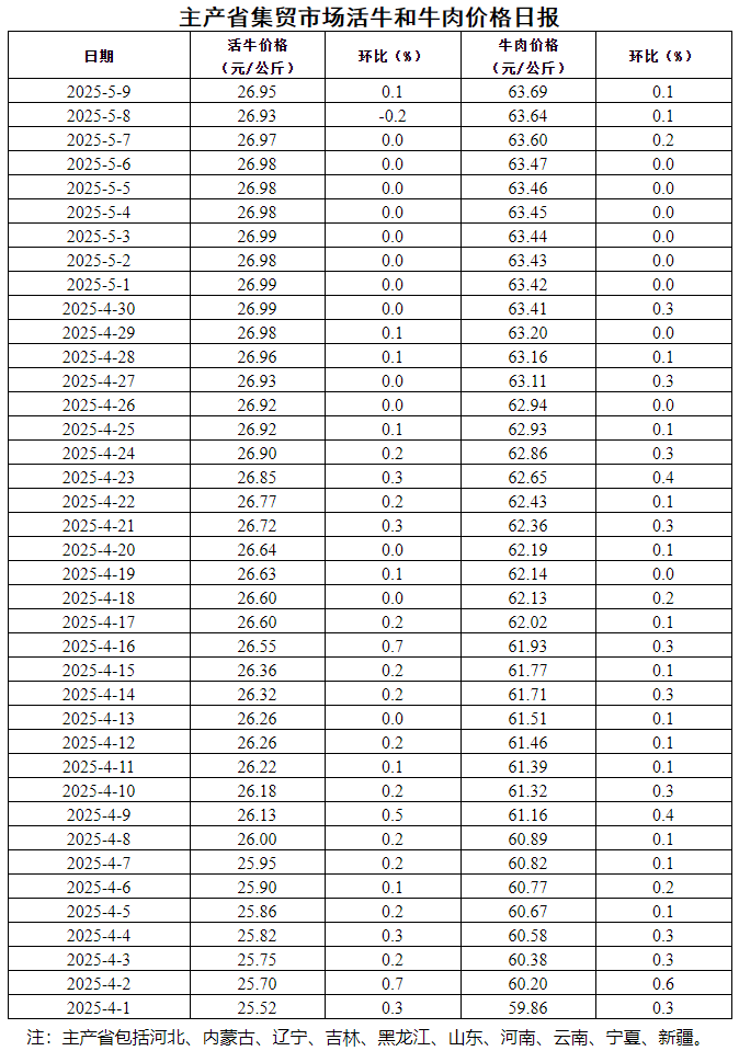 普悦 ·资讯 | 5月9日主产省集贸市场活牛和牛肉价格环比均上涨0.1%