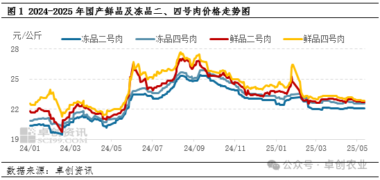 【导语】2024年9月份以来,国内鲜品及冻品猪肉价格皆呈现跌后趋稳的态势,但因国产冻品库存较小,支撑价格跌幅偏小。随着鲜冻价差不断收窄,至2025年5月鲜品对冻品的替代效应不断增强,冻品市场成交寡淡。后期来看,至年底屠宰企业大批量主动入库的概率较低,预计冻猪肉行情或维持供需两淡的格局,鲜冻价差仍然较小。