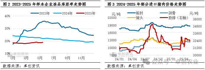 第一,屠宰企业库存压力较小,有一定挺价意向。从图2看到,伴随着屠宰企业冻品库存陆续释放,且企业暂无大批量入库意向,2023年6月份以来冻品库存不断下降,至2025年5月已降至偏低水平。据卓创资讯统计,截至2025年5月第二周,样本屠宰企业平均冻品库容率为18.93%,较去年同期下降3.03个百分点,较2023年同期下降16.63个百分点。因库存压力较小,在鲜品猪肉价格持续下滑的背景下,屠宰企业有一定挺价意向,冻品价格跌幅小于鲜品。