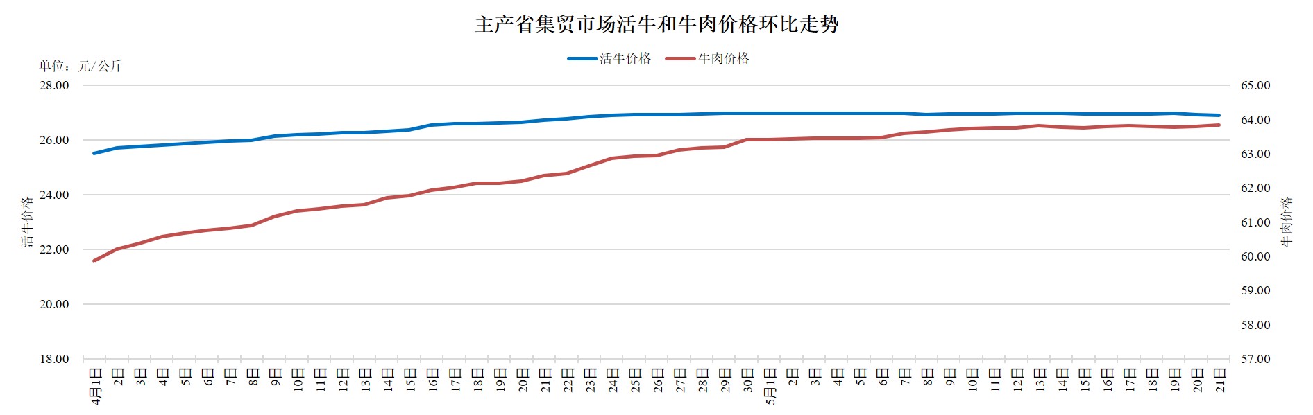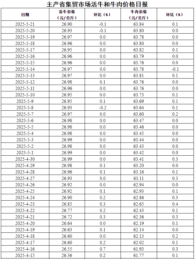 据农业农村部监测,2025年5月21日,主产省集贸市场活牛价格26.90元/公斤,同比上涨16.2%,环比下跌0.1%;牛肉价格63.84元/公斤,同比上涨6.1%,环比上涨0.1%。