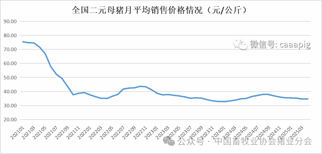 1、2025年4月份全国二元母猪销售价格34.49元/公斤,环比下跌0.5%,同比下跌0.7%。