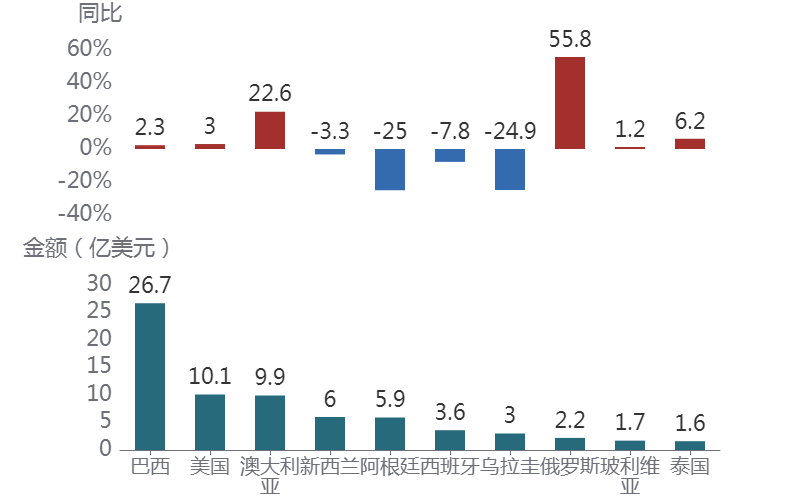 前4个月,巴西是我国肉类及制品进口最主要的市场,进口额为26.7亿美元,同比增长2.3%。4月当月,进口额为5.9亿美元,同比增长4.4%。