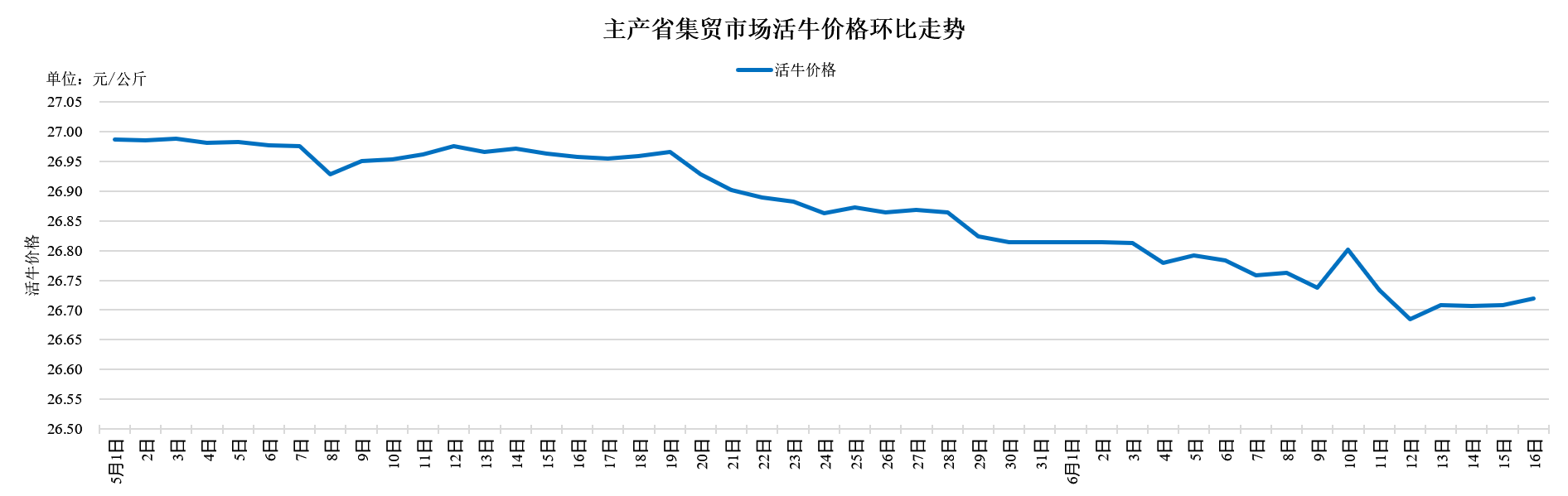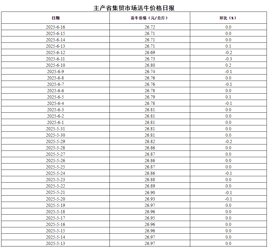 据农业农村部监测,2025年6月16日,主产省集贸市场活牛价格每公斤26.72元,同比上涨13.6%,环比持平。