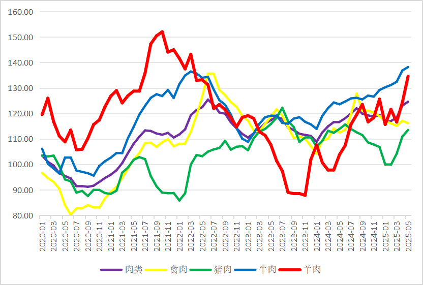 2025年5月份,FAO肉类价格指数小幅上涨,其中,猪肉、牛肉、羊肉价格上涨,禽肉价格下跌。FAO肉类价格指数(基期为2014—2016年)2024年1月份降至108.86后反弹,2025年5月份为124.60,环比涨1.3%,同比涨6.8%。