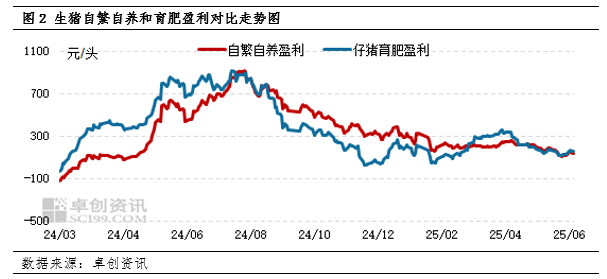 二季度生猪自繁自养盈利和仔猪育肥盈利呈先涨后震荡下滑走势。据卓创资讯监测数据显示,截至6月19日,全国生猪自繁自养盈利值为137.93元/头,较4月初下滑66.12元/头。仔猪育肥盈利为153.42元/头,较4月初下滑151.05元/头。生猪交易均重高位盘整,叠加料肉比仍为正值,一定程度缓冲了盈利下滑的速度。仅在5月中旬过后,随着生猪降价速度加快,盈利值加速下滑。
