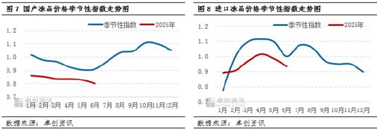 下半年冻品或呈现季节性上涨走势,8月份之后国产冻品需求或增幅较为明显。上半年采购不及预期水平,且囤货力度下半年或继续偏弱,目前国产鲜品价格偏低,或进一步冲击冻品销量,部分下游经销商存在冻品改鲜品采购现象,因此下半年国产冻品需求好转程度或不及预期。