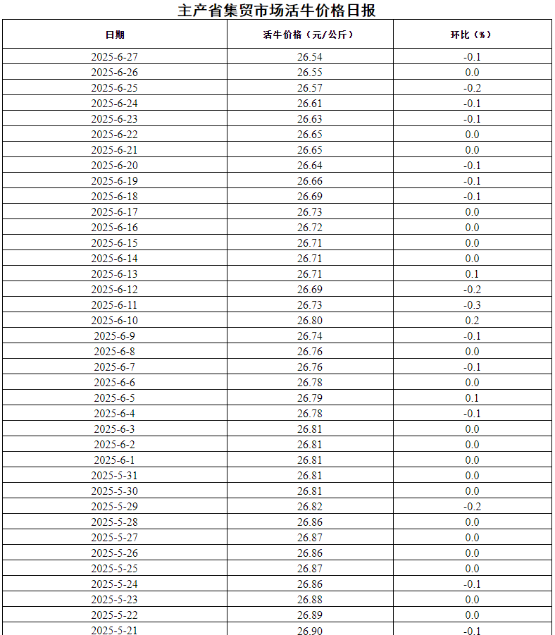 据农业农村部监测,2025年6月27日,主产省集贸市场活牛价格每公斤26.54元,同比上涨12.5%,环比下跌0.1%。