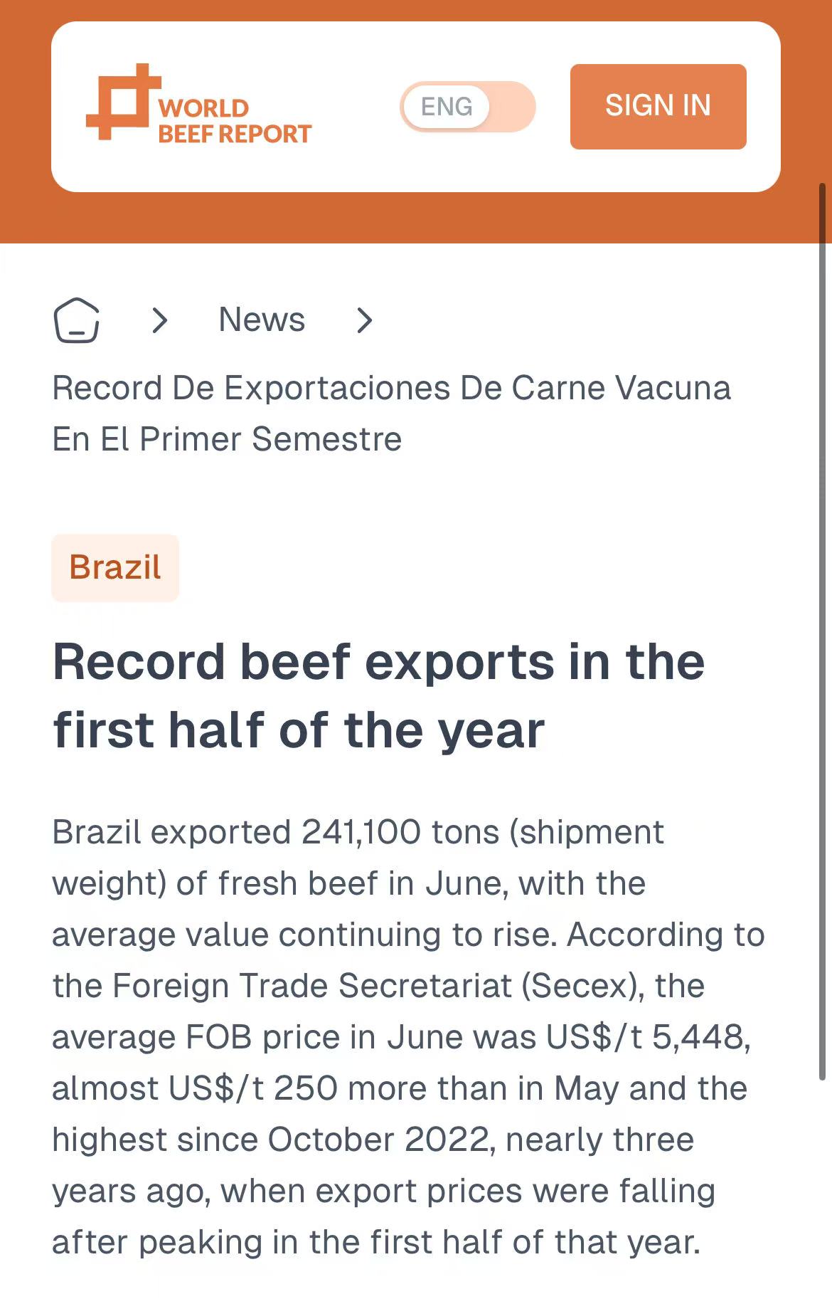 巴西6月出口鲜牛肉241,100吨(装运重量),平均价格持续上涨。据外贸秘书处(Secex)称,6月平均离岸价格为每吨5448美元,比5月高出近250 美元,为2022年10月以来的最高水平,当时出口价格在上半年达到峰值后开始下跌。