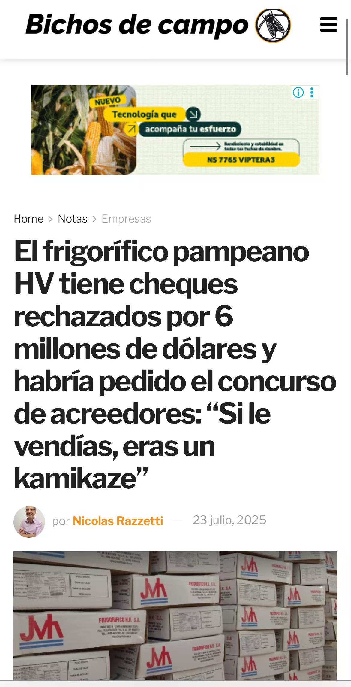 又一家阿根廷肉类企业陷入危机!注册于贝尔纳斯科尼镇的FRIGORIFICO H V S A公司(阿根廷5209厂)被曝债务违约,官方确认其负债高达83.2亿比索(约670万美元),非官方消息称已启动破产程序。