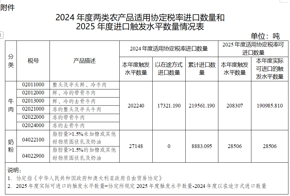 据中国海关总署公告,2025年澳大利亚牛肉的特殊保障措施关税数量上限被设定为208,307吨,扣除上年结转数量后,今年实际可用的触发量水平略低于190,986吨。