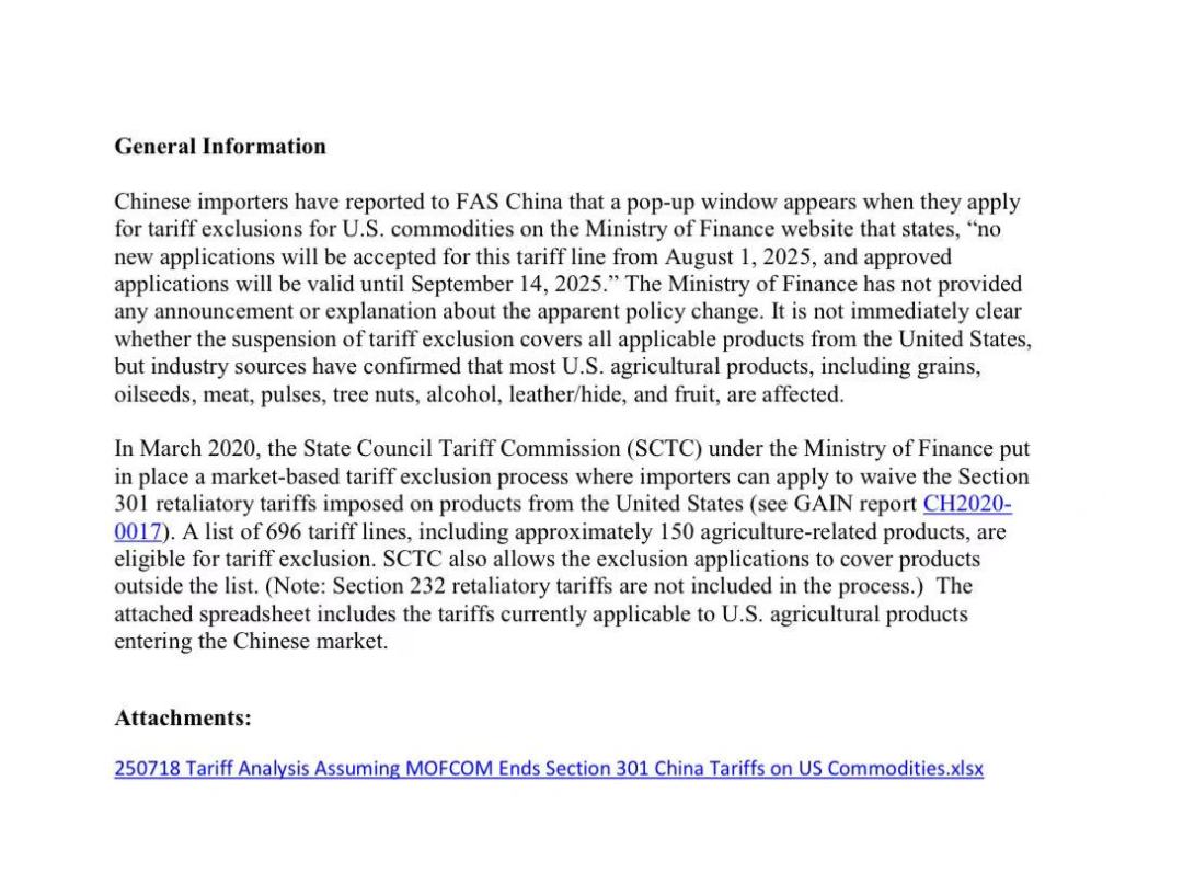据美国农业部(USDA)最新报告显示,中国拟于8月1日起全面暂停对美国农产品的关税豁免申请,已获批的豁免也仅能维持至9月14日。这一未官宣的“静默政策”可能重创中美农产品贸易,波及谷物、肉类、水果等150余类商品,或引发全球市场连锁反应!