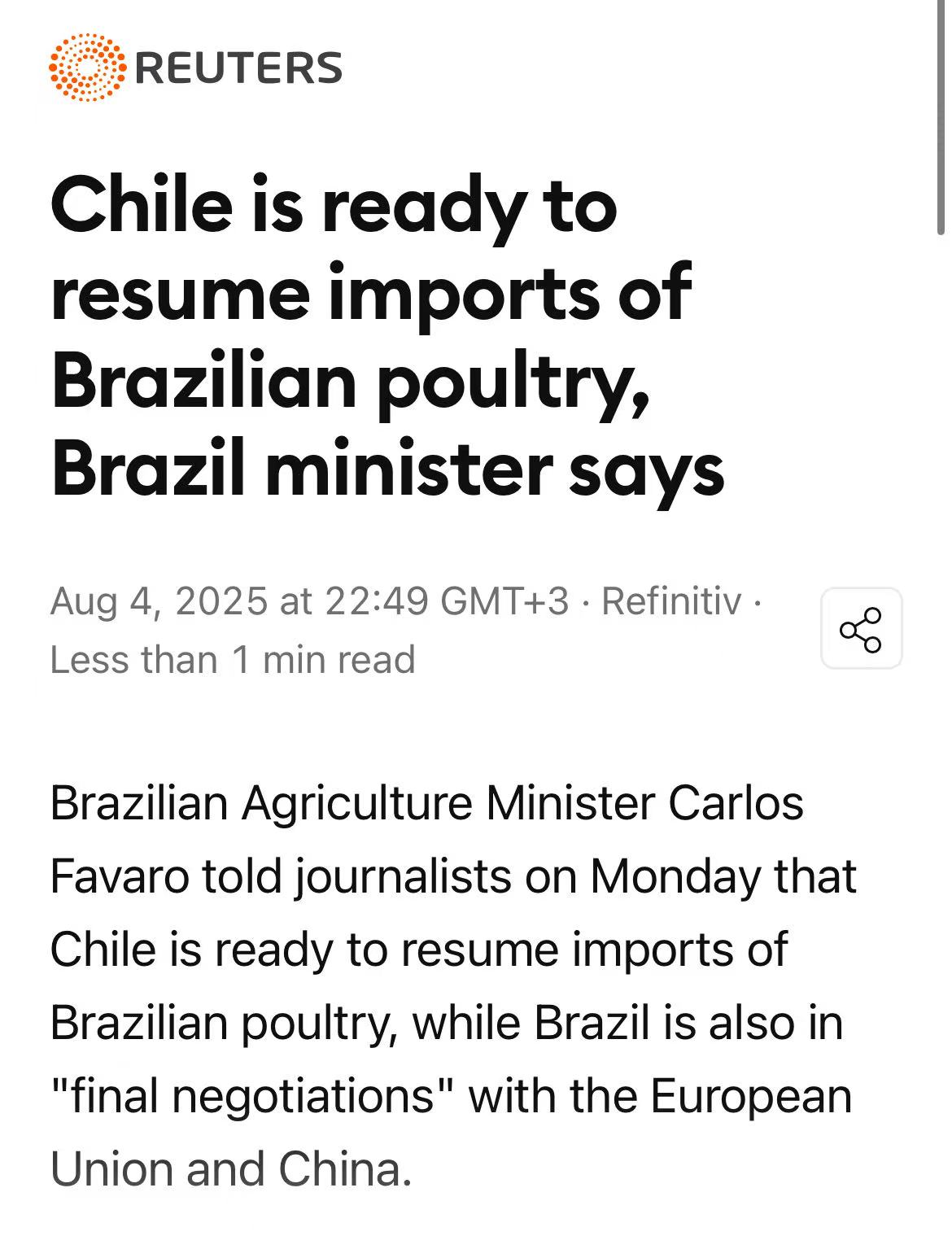智利率先行动:已正式确认恢复进口巴西鸡肉,贸易通道全面重启;