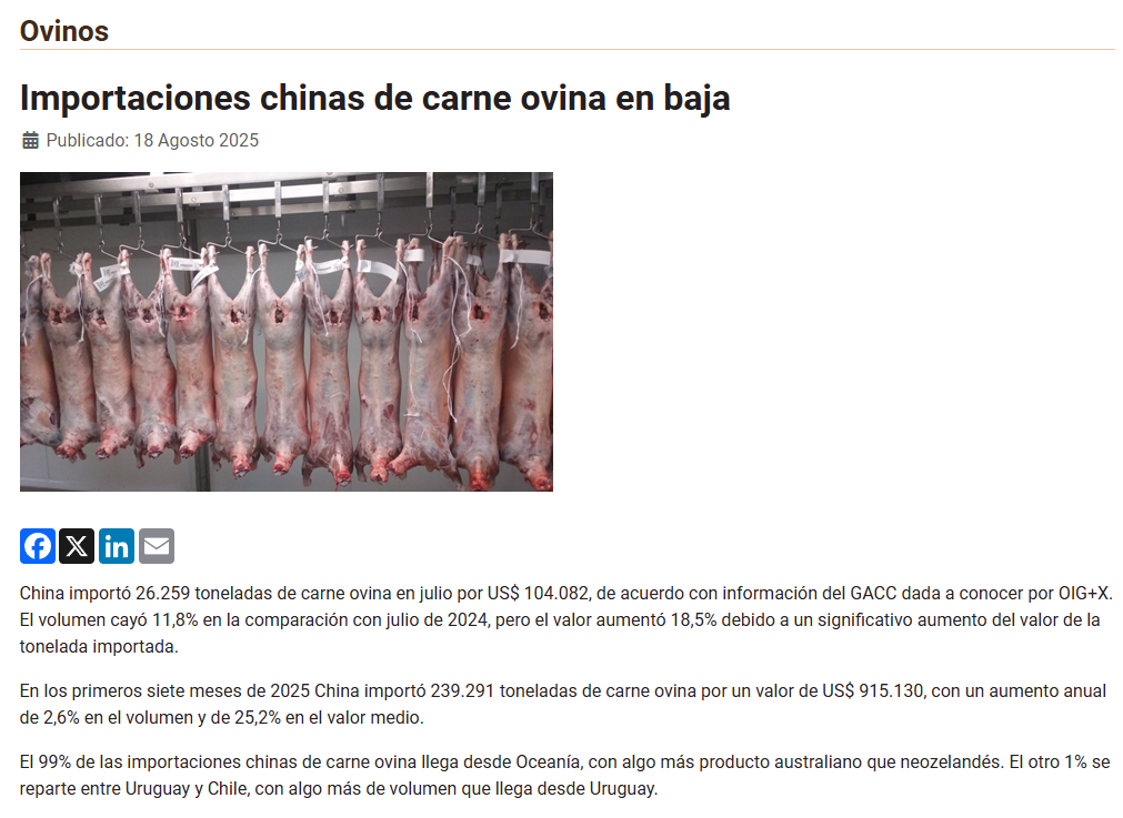 根据OIG+X发布的GACC数据,中国7月份羊肉进口量为26,259吨,进口额为104,082美元。与2024年7月相比,进口量下降了11.8%,但由于单价大幅上涨,进口额同比增长了18.5%。