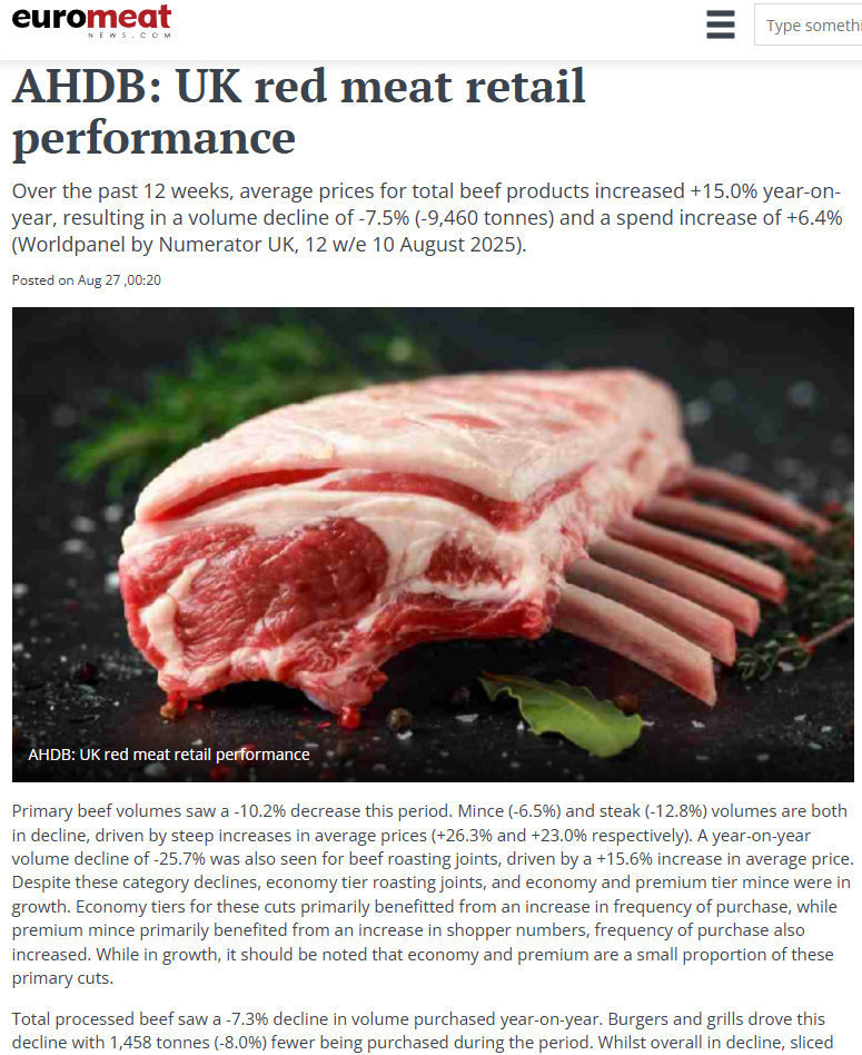 2024–2025财年,牛肉产量创下历史新高,羔羊屠宰量维持在接近纪录的水平,羊肉产量则飙升至2007年以来的最高水平。
