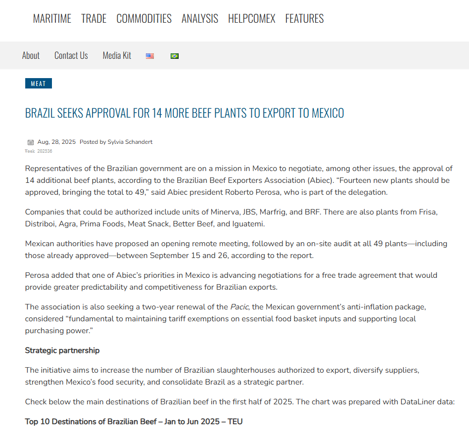 此项合作旨在扩大获准对墨出口的巴西屠宰场数量,实现供应来源多元化,增强墨西哥的粮食安全,并巩固巴西作为其战略合作伙伴的地位。