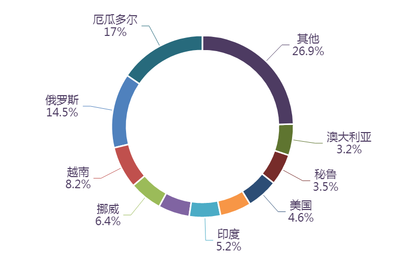 市场方面,前7个月,我国水海产品及制品进口额排名前十的国家/地区分别为厄瓜多尔、俄罗斯、越南、挪威、印度尼西亚、印度、加拿大、美国、秘鲁、澳大利亚,合计占我国该产品进口额的73.1%。
