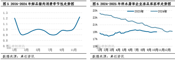 长期来看,预计11-12月份国产鲜品猪肉价格或先涨后跌,冻品价格继续缓跌。根据生猪的生长周期推算,2025年四季度国内适重猪源充裕;同时从图5看到,11-12月份鲜猪肉需求亦有明显提升。供需双增,其中11月份因市场大猪供应偏少,部分养殖端或存压栏增重的意向,一定程度上缓解供应过剩的状态,国内鲜品猪肉价格或低位小涨;但幅度十分有限,涨幅或在5%以内。12月份供应压力凸显,鲜品猪肉价格或再度回落,幅度或在3%以内。因鲜品猪肉价格较低,对冻品销售产生冲击,屠宰企业及进口商或降价走量,11-12月份冻猪肉价格或缓跌为主;因其企业及港口冻品库存压力不大,预计价格累计跌幅或在5%-10%。