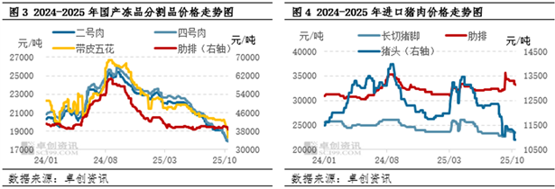 伴随着鲜品猪肉价格持续下降,冻品猪肉价格优势不断削弱,部分产品甚至产生“倒挂”现象,屠宰企业存降价走量的操作,国产冻品价格亦跟随下调;但在国储订单及部分食品加工厂因原料价低而增加冻品订单的支撑下,国产冻品猪肉价格跌幅不及鲜品。据卓创资讯统计,截至2025年10月14日,国产冻品二号肉成交均价为17875元/吨,冻四号肉成交均价为17913元/吨,冻带皮五花成交均价为18306元/吨,冻肋排成交均价38786元/吨,半月内累计跌幅分别为4.19%、4.47%、9.35%、3.21%。与此同时,进口商普遍库存压力较小,且从关税调整因素考虑对后市存一定乐观预期,多挺价观望,导致进口产品价格跌幅较小,市场成交寡淡,部分产品处于有价无市的状态。据卓创资讯统计,截至2025年10月14日,进口猪头成交均价为10917元/吨,长切猪脚成交均价为23433元/吨,肋排成交均价33217元/吨,半月内累计跌幅分别为3.53%、0.71%、2.45%。