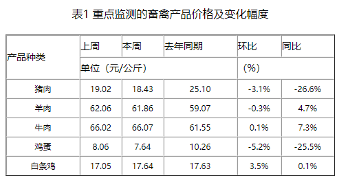 本周重点监测的畜禽产品猪肉、羊肉、牛肉、鸡蛋和白条鸡与上周相比,变化幅度在-5.2~3.5%之间(如表1所示)。