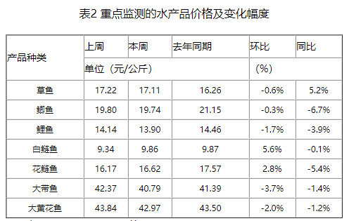 本周,重点监测的水产品草鱼、鲫鱼、鲤鱼、白鲢鱼、花鲢鱼、大带鱼和大黄花鱼与上周相比,变化幅度在-3.7~5.6%之间(如表2所示)。