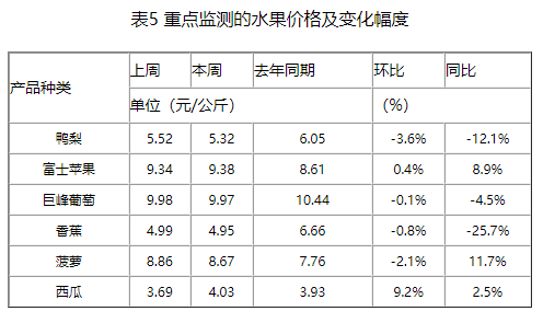 本周重点监测的6种水果平均价格为7.05元/公斤,比上周下降0.1%,同比下降2.6%(如表5所示)。