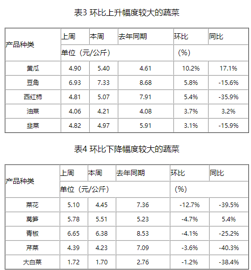 监测的19种蔬菜价格中,本周黄瓜、豆角、西红柿、油菜和韭菜的价格环比涨幅较大,幅度分别为10.2%、5.8%、5.4%、3.7%和3.1%(如表3所示);菜花、莴笋、青椒、芹菜和大白菜的价格环比降幅较大,幅度为12.7%、4.7%、4.1%、3.6%和1.2%(如表4所示)。