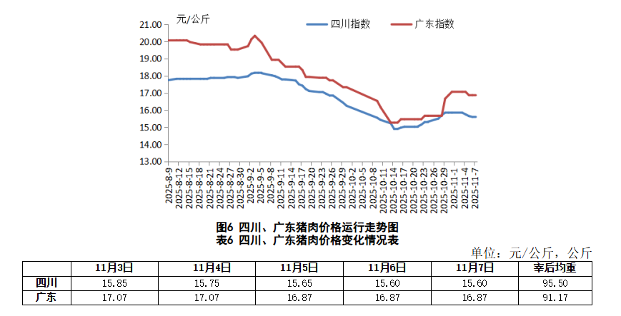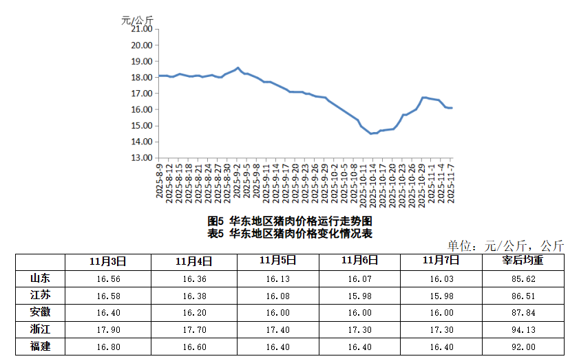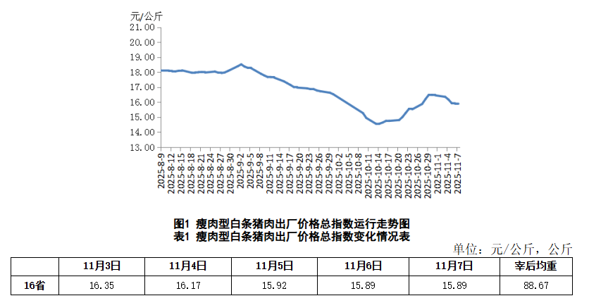 据农业农村部信息中心和山东卓创资讯股份有限公司联合监测,2025年第45周(即2025年11月3日-11月7日,以下简称本周),16省(直辖市)瘦肉型白条猪肉出厂价格总指数的周平均值为每公斤16.04元,环比下跌1.5%,同比下跌27.9%,较上周跌幅扩大0.2个百分点。