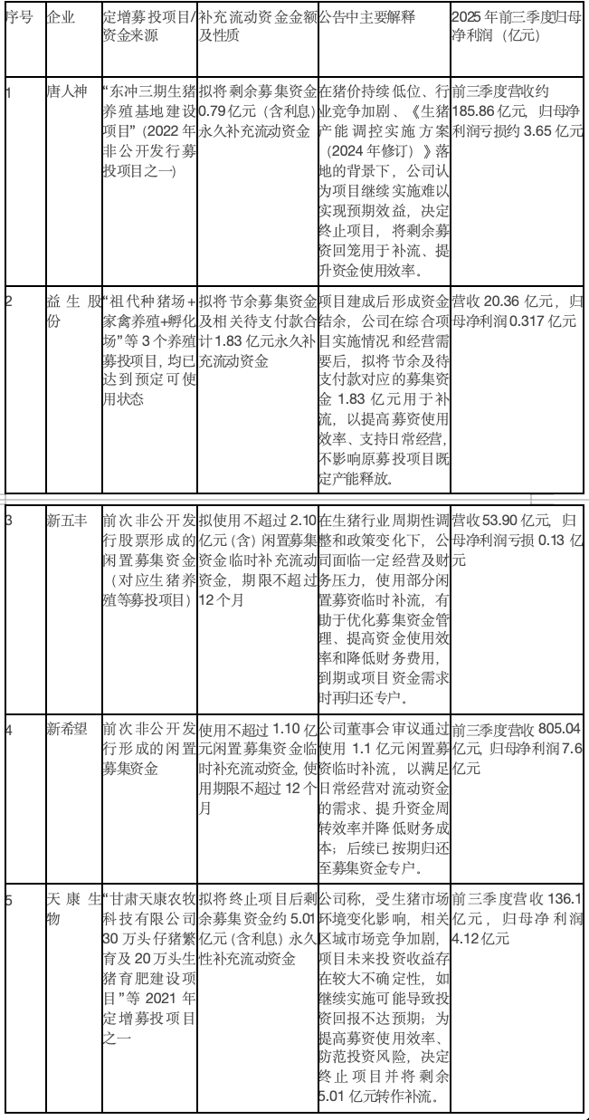 蓝鲸新闻记者梳理上市公司公告发现,从唐人神到益生股份,从新五丰到新希望,今年以来至少有5家上市猪企宣布将前次定增募投项目资金“挪作他用”,永久或阶段性补充流动资金。