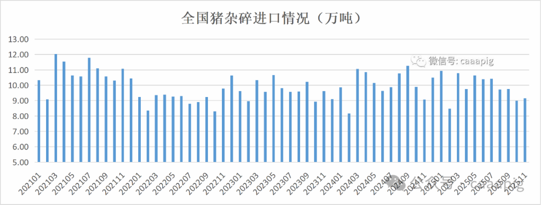 2、2025年11月进口猪杂碎9.16万吨,环比增长1.9%,同比增长1.0%。