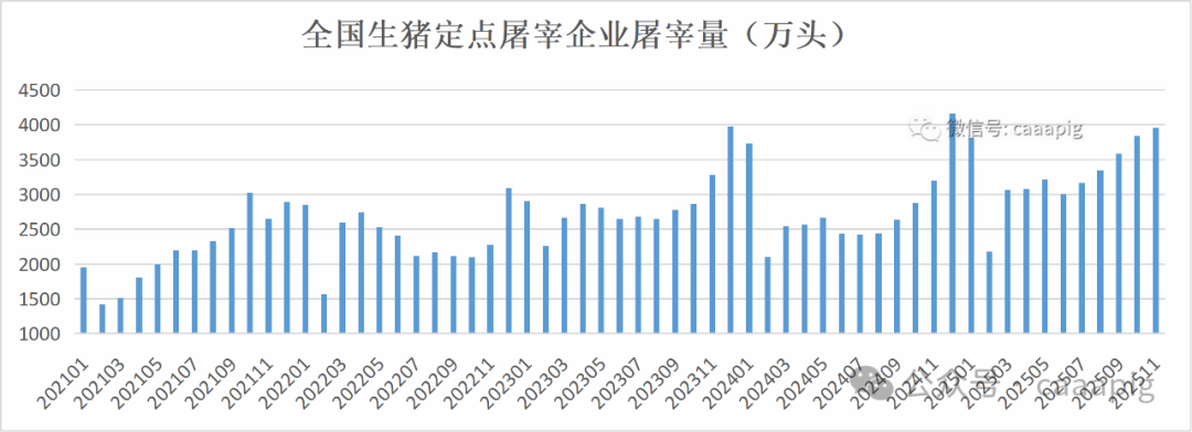 2、2025年1-11月生猪定点屠宰企业屠宰量36246万头,同比增长19.3%。