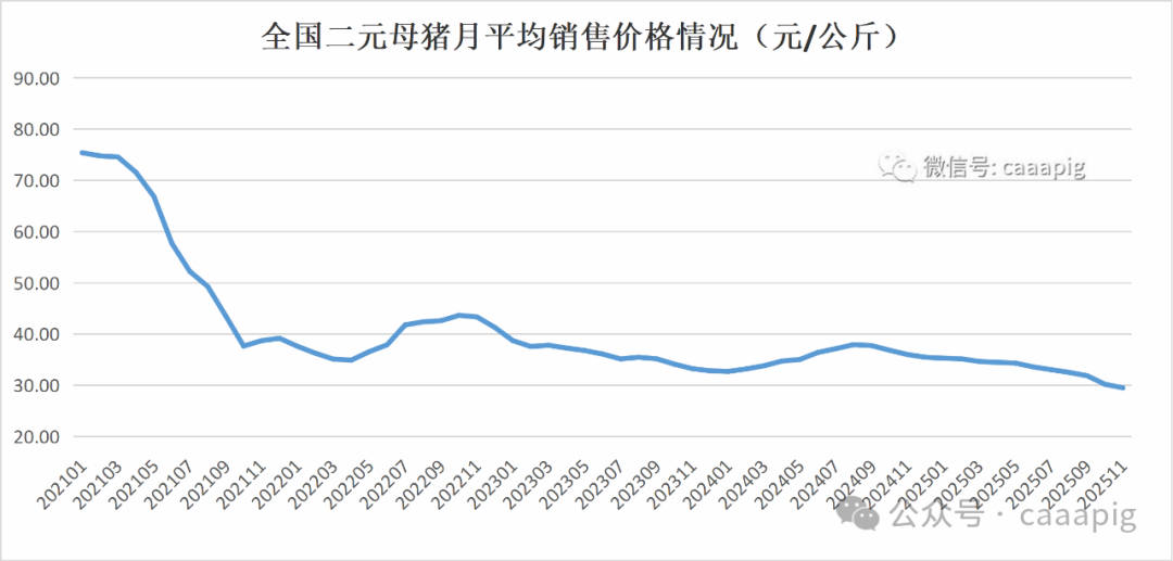 1、2025年11月份全国二元母猪销售价格29.51元/公斤,环比下跌2.3%,同比下跌18.0%。