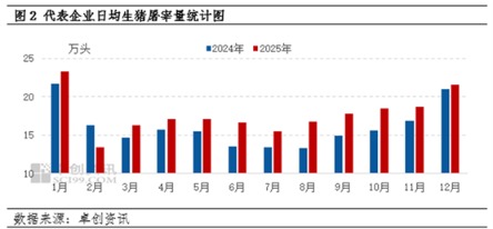 另外,值得关注的是,与2024年同期相比,2025年12月份生猪供应及猪肉需求均同比增加,一方面,2025年处于生猪产能完全释放阶段,生猪出栏量同比显著增多;另一方面,2025年12月份全国白条猪肉出厂均价同比降幅26.21%,猪肉价格低位刺激终端猪肉消费,从而支撑屠宰需求增加。据卓创资讯监测数据显示,12月份代表屠宰企业日均屠宰量同比增幅2.54%。