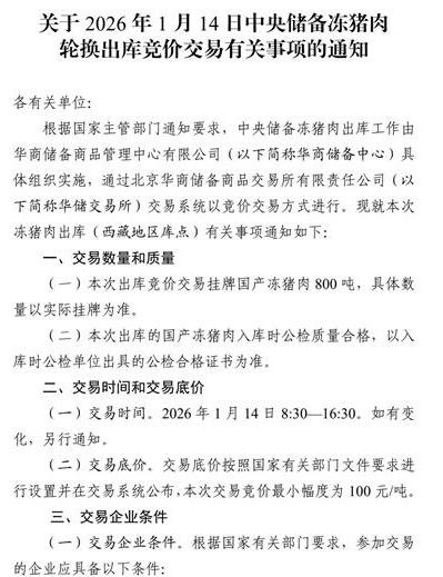 《关于2026年1月14日中央储备冻猪肉轮换出库竞价交易有关事项的通知》显示,将于1月14日出库竞价交易挂牌国产冻猪肉800吨,具体数量以实际挂牌为准。