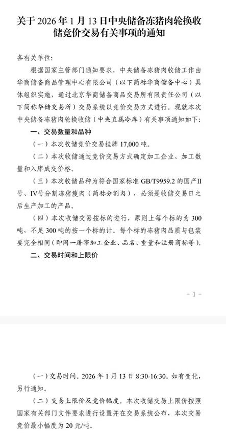 《关于2026年1月13日中央储备冻猪肉轮换收储竞价交易有关事项的通知》显示,将于1月13日收储竞价交易挂牌17000吨。
