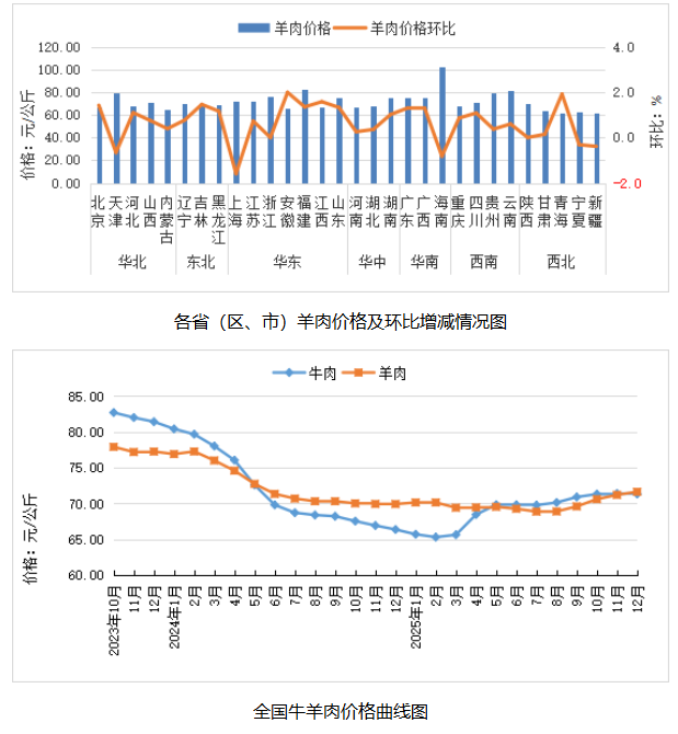 全国羊肉平均价格71.63元/公斤,同比涨2.4%,环比涨0.6%。河北、内蒙古、山东、河南和新疆等主产省份羊肉平均价格69.30元/公斤,同比涨8.0%,环比涨0.8%。从涨跌情况看,东北地区环比涨幅较大,吉林领涨,涨幅为1.5%。