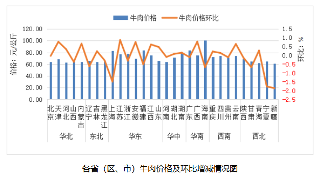 全国牛肉平均价格71.32元/公斤,同比涨7.5%,环比跌0.1%。河北、辽宁、吉林、山东和河南等主产省份牛肉平均价格为65.16元/公斤,同比涨18.9%,环比跌0.2%。从涨跌情况看,华北地区环比涨幅较大,天津领涨,涨幅为0.8%;西北地区环比跌幅较大,新疆领跌,跌幅为1.9%。