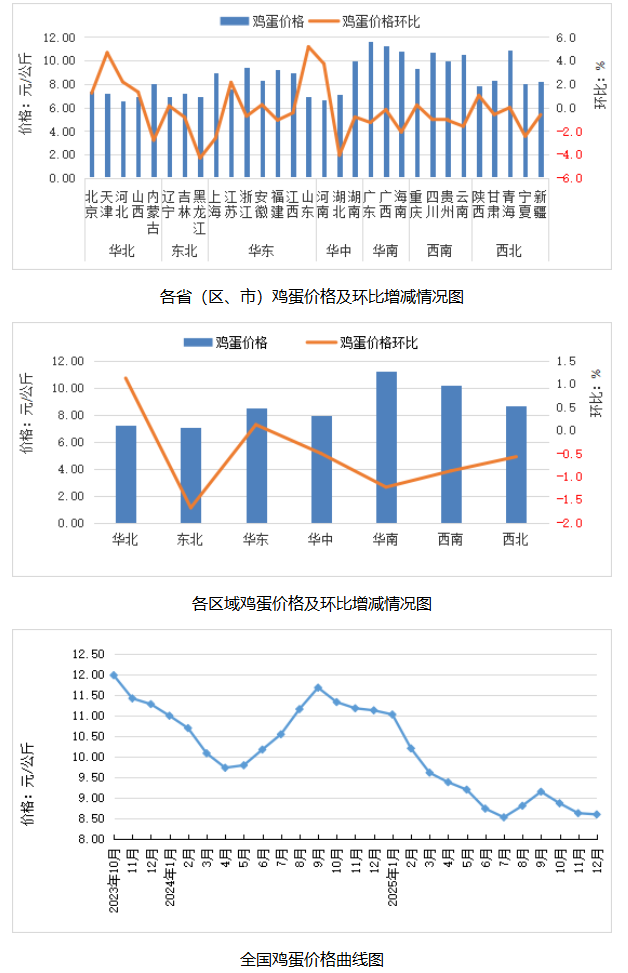 据对全国500个县集贸市场和采集点的监测,2025年12月份,鸡蛋、肉羊、豆粕、肉鸡配合饲料价格环比上涨,生猪产品、商品代雏鸡、鸡肉、肉牛价格环比下降,生鲜乳、玉米、育肥猪配合饲料、蛋鸡配合饲料价格环比持平。按集贸市场监测口径,本月猪粮比价为5.01:1,比上月下跌0.15个点。