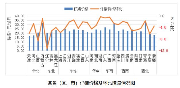 全国仔猪平均价格23.39元/公斤,同比跌29.5%,环比跌3.5%。从涨跌情况看,全国29个监测省份价格均下跌。其中,东北地区环比跌幅较大,辽宁领跌,跌幅为11.3%。从价格水平来看,华南地区仔猪平均价格最高,为27.89元/公斤;华北地区最低,为21.85元/公斤。
