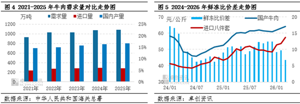 牛肉需求持续增长,进口依赖度先增后减。2025年我国牛肉总消费量约1080.00万吨,较2024年增长3.48%。其中进口牛肉达283.39万吨,占比26.24%,较2024年占比下滑1.00个百分点,国内牛肉产量增至801万吨,占比74.16%,进口牛肉占比份额有所下滑。受政策收紧叠加配额限制,2026年起实施“国别配额+配额外55%关税”,全年配额268.8万吨,较2025年减少5.15%,进口占比或将进一步下降。