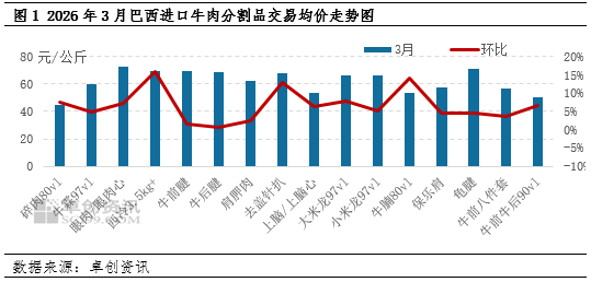 综合来看,2026年下半年进口牛肉市场将进入“配额见底、成本跃升”的新阶段。巴西、澳大利亚等主要来源国额度陆续耗尽后,配额外55%的高额关税将实质性推动到岸成本上升。与此同时,国内能繁母牛去化效应持续释放,肉牛牛出栏量逐步缩减。在进口成本高企与国内产能收紧的双重支撑下,国产牛肉价格上行趋势有望进一步强化。卓创资讯预计5月国产牛肉价格在64.00-72.00元/公斤区间,进口牛肉(八件套)价格在56.00-60.00元/公斤区间。