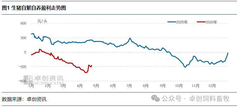【导语】2026年1-4月上半月生猪自繁自养亏损不断扩大,但随着养殖端缩量提价,生猪价格低位反弹,带动自繁自养盈利回暖,头均亏损值缩小。从产能角度来看,生猪供应量仍然较为充沛,猪价或暂时不具备持续上涨条件,短线行情或继续低位震荡,自繁自养盈利亦跟随调整。