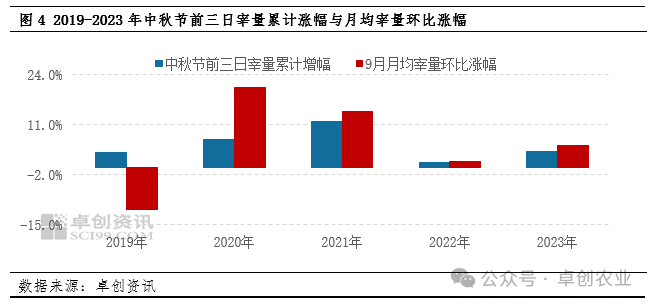 根据卓创资讯对过去五年中秋节前三日屠宰量数据统计,除2019年外,2020-2023年月均屠宰量增幅在5%-15%,增量幅度相对明显。而从中秋节前三日的宰量增幅角度分析,2019-2021年,节前均有相对明显的增量。基于本月中秋节和国庆节接踵而至,加之院校开学对分割品提振相对明显,屠宰厂或少量增加鲜销分割量,支撑月内屠宰量同步上涨。