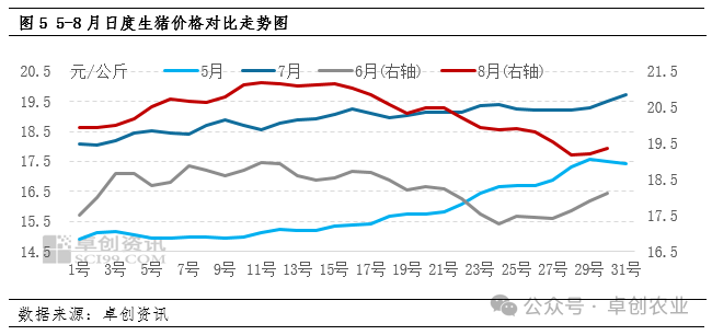 而根据5-8月日度生猪价格走势对比发现,5月和7月在后市涨价预期明确的情况下,二次育肥积极入市,加大供应缺口,对猪价有较强支撑,月内猪价走势呈现震荡上涨走势。而6月和8月在缺少二次育肥大量入场的影响下,月内猪价走势呈先涨后降走势。考虑9月二次育肥呈现滚动式补栏,补栏量较5月和7月明显下滑,且有部分猪源或在中秋节前逢高出栏,不排除9月猪价与6月和8月走势相似的可能性,呈现出先涨后降。