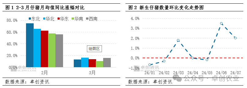 按照生猪生长周期推算,9月出栏的生猪对应的是2-3月新生仔猪,而根据卓创资讯对大区仔猪月均价涨幅推算,2-3月仔猪月均价涨幅明显,其中东北涨幅最大,其次华北,华南和西南涨幅相对偏小。叠加种猪资源区域分布分析,南方市场仔猪供应量多于北方,2-3月仔猪补栏量增加。同时从新生仔猪数据发现,2月过后,新生仔猪数据环比转正,而根据6个月左右的出栏周期推算,对应9月份生猪出栏量理论值增加。当然企业可以考虑压栏,但最多延长出栏周期1-2个月。