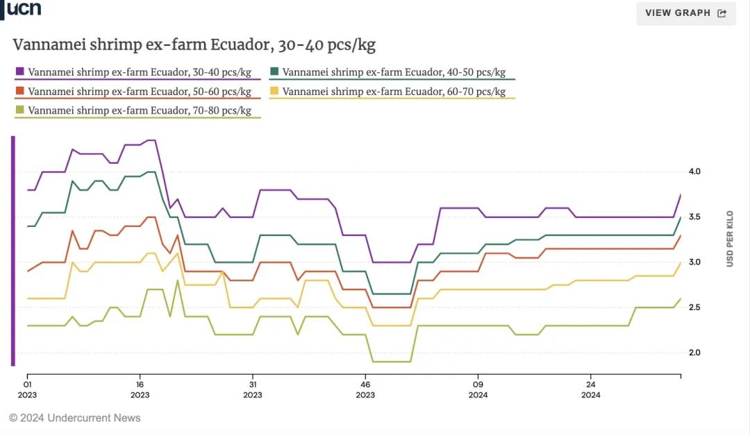 UCN统计,上周厄瓜多尔瓜亚斯省地区30/40规格带头南美白虾出塘价格环比上涨7%,至$3.75/kg,打破了持续近半年的价格瓶颈。自今年一月底以来,30/40规格一直维持在$3.50-3.60/kg区间,变化幅度较小。