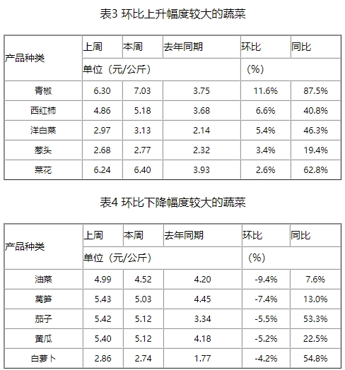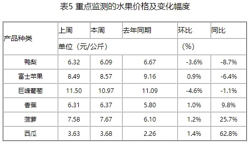 本周,重点监测的水产品草鱼、鲫鱼、鲤鱼、白鲢鱼、花鲢鱼、大带鱼和大黄花鱼与上周相比,变化幅度在-0.5~1.8%之间(如表2所示)。 全国286家产销地批发市场19种蔬菜平均价格为5.20元/公斤,与上周持平,同比上升26.5%。 监测的19种蔬菜价格中,本周青椒、西红柿、洋白菜、葱头和菜花的价格环比涨幅较大,幅度分别为11.6%、6.6%、5.4%、3.4%和2.6%(如表3所示);油菜、莴笋、茄子、黄瓜和白萝卜的价格环比降幅较大,幅度为9.4%、7.4%、5.5%、5.2%和4.2%(如表4所示)。 本周重点监测的6种水果平均价格为7.23元/公斤,比上周下降1.1%,同比上升5.5%(如表5所示)。 注:19种蔬菜是指大白菜、西红柿、黄瓜、青椒、芹菜、土豆、白萝卜、茄子、豆角、胡萝卜、菜花、韭菜、蒜苔、大葱、葱头、油菜、菠菜、洋白菜、莴笋;6种水果是指富士苹果、巨峰葡萄、香蕉、菠萝、西瓜、鸭梨。 来源: 农业农村部信息中心 发布时间:2024年9月13日
