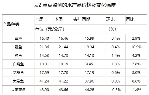 本周重点监测的畜禽产品猪肉、羊肉、牛肉、鸡蛋和白条鸡与上周相比,变化幅度在-0.4~1.8%之间(如表1所示)。
